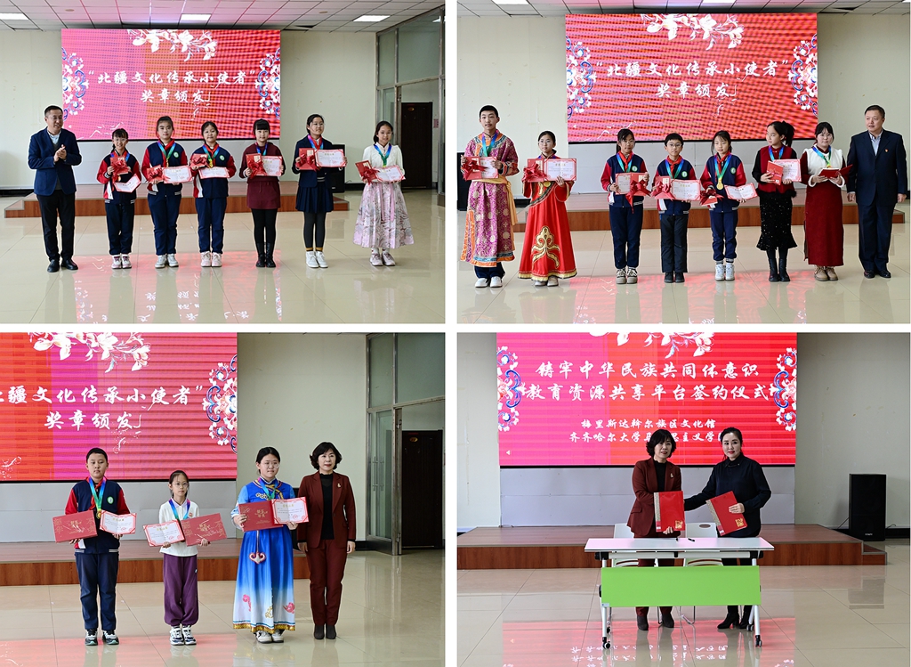 馬克思主義學(xué)院領(lǐng)導(dǎo)為參與活動的中小學(xué)生頒發(fā)了“北疆文化傳承小使者”獎?wù)虏①浰蜁防锼惯_斡爾族區(qū)文化館與我校馬克思主義學(xué)院簽訂了鑄牢中華民族共同體意識教育資源共享平臺建設(shè)協(xié)議。