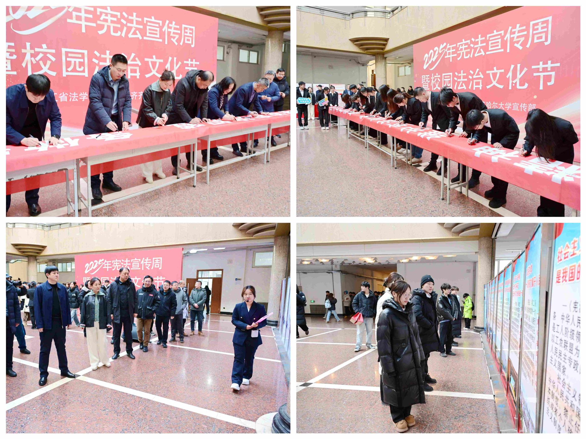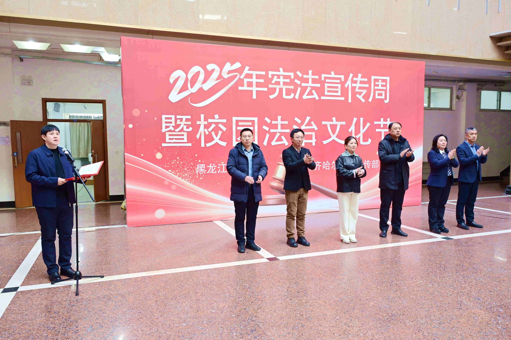 為認(rèn)真貫徹黨的二十大和二十屆歷次全會(huì)精神,深入學(xué)習(xí)宣傳習(xí)近平法治思想,弘揚(yáng)社會(huì)主義法治精神,大力加強(qiáng)憲法宣傳教育,提升師生法治素養(yǎng),在第十二個(gè)國(guó)家憲法日即將到來之際,12月2日中午,學(xué)校2025年“憲法宣傳周”暨校園法治文化節(jié)開幕式在西區(qū)守正樓陽(yáng)光大廳舉行,校黨委副書記、工會(huì)主席齊宏偉出席并致辭,黨委常委、宣傳部部長(zhǎng)杜海權(quán)主持,相關(guān)職能部門負(fù)責(zé)人、師生代表百余人參加。
