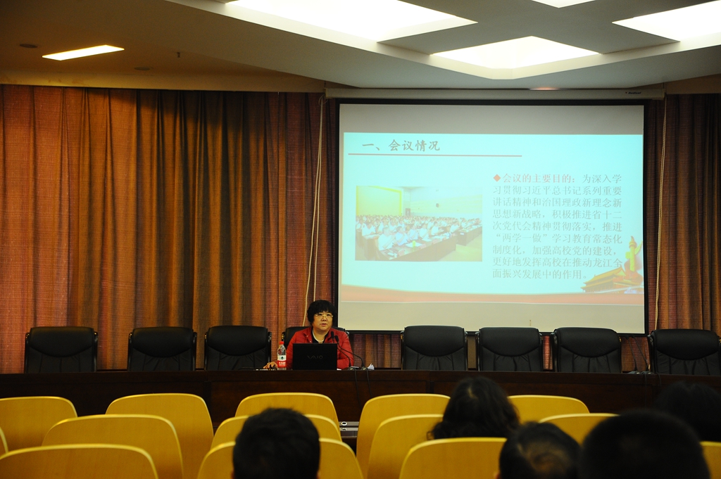 會上,校黨委宣傳統(tǒng)戰(zhàn)部部長王曉梅作了題為《學習張慶偉書記在全省高校暑期書記校長研討班上的講話》的報告。她從“強化思想武裝,始終保持政治上的堅定自覺”、“認清形勢任務,主動融入全面振興龍江發(fā)展大局”、“堅持立德樹人,切實加強高校思想政治工作”和“從嚴管黨治黨,營造風清氣正的高校政治生態(tài)”等4個方面,對省委書記張慶偉在全省高校2017年暑期書記校長研討班上的講話精神進行了全面、詳盡的闡述和解讀。