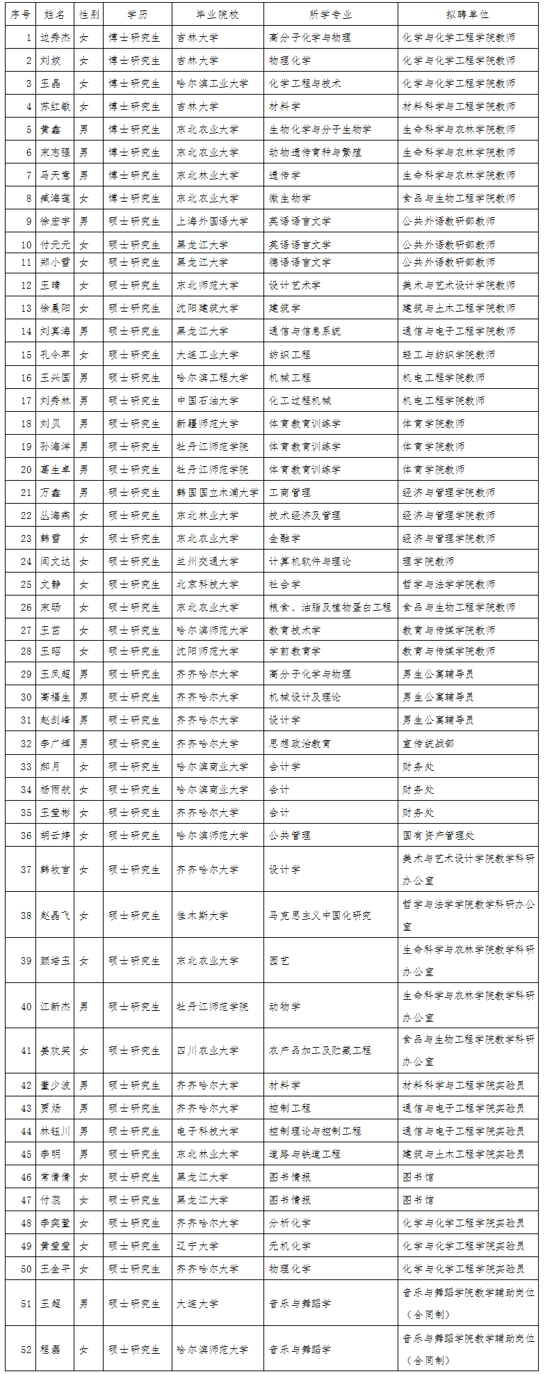 按照《黑龍江省事業(yè)單位公開招聘工作人員實施細(xì)則》的規(guī)定,根據(jù)《齊齊哈爾大學(xué)2017年上半年公開招聘人員公告》明確的原則、程序和方法,現(xiàn)將擬聘用人員予以公示。如對公示人員有異議,可在公示期內(nèi)反映,反映情況和問題必須實事求是,應(yīng)簽署或告知真實姓名、工作單位和聯(lián)系方式;對線索不清的匿名信和匿名電話,公示期間不予受理。