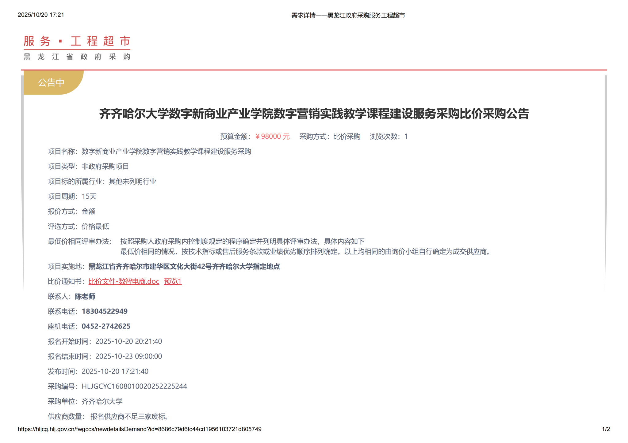 下一條:齊齊哈爾大學(xué)數(shù)字新商業(yè)產(chǎn)業(yè)學(xué)院數(shù)智電商實踐教學(xué)課程建設(shè)服務(wù)采購比價采購公告(轉(zhuǎn)自黑龍江省政府采購網(wǎng))