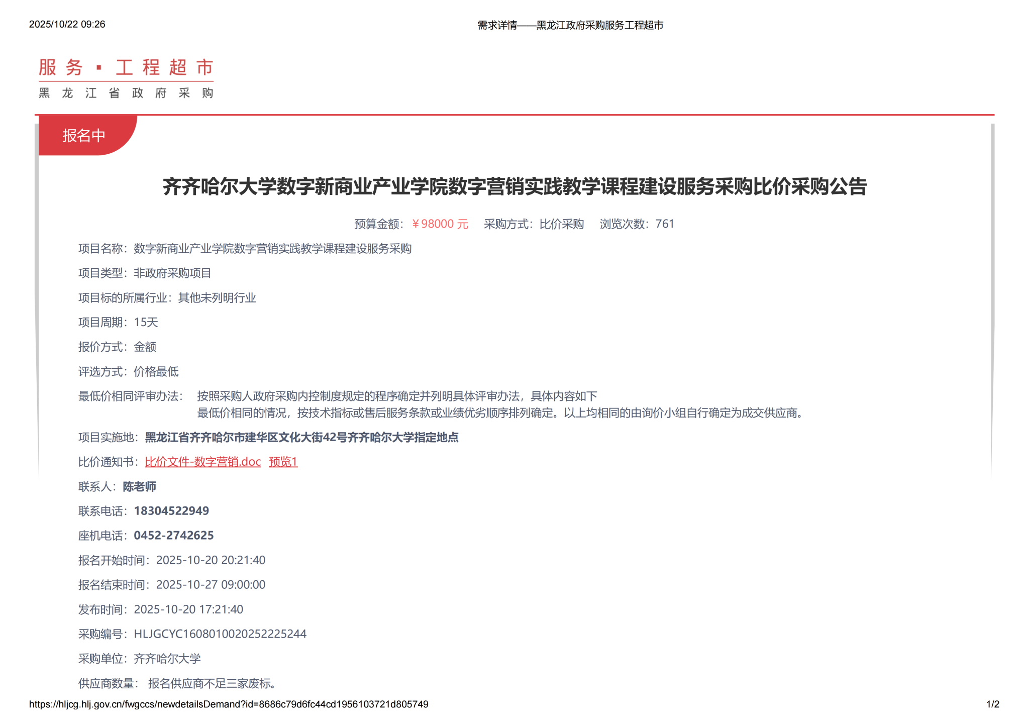 下一條:齊齊哈爾大學(xué)數(shù)字新商業(yè)產(chǎn)業(yè)學(xué)院數(shù)字營(yíng)銷實(shí)踐教學(xué)課程建設(shè)服務(wù)采購(gòu)比價(jià)采購(gòu)公告(轉(zhuǎn)自黑龍江省政府采購(gòu)網(wǎng))