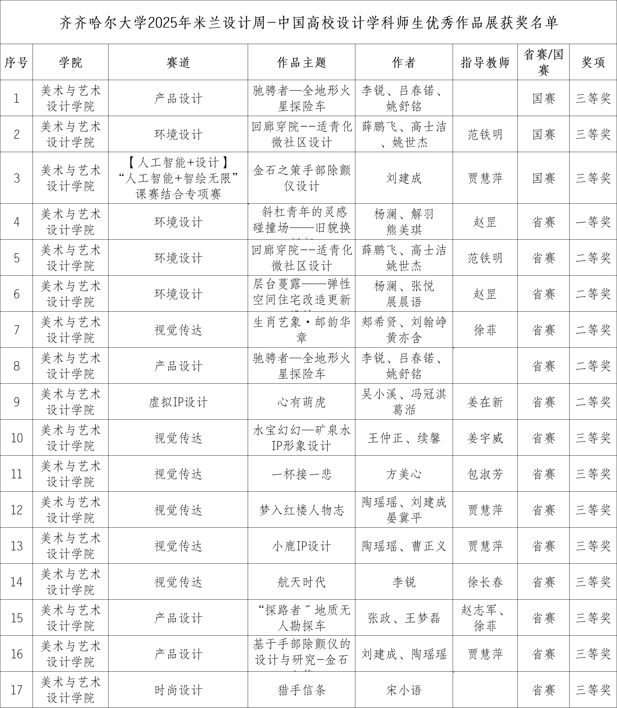 本次大賽取得的成績彰顯了我校“教賽融合、產(chǎn)教協(xié)同”的辦學(xué)特色,是對設(shè)計(jì)學(xué)科教學(xué)質(zhì)量與人才培養(yǎng)成效的充分肯定,也是學(xué)校深化教學(xué)改革、優(yōu)化學(xué)科建設(shè)、精準(zhǔn)對接我省“4567”現(xiàn)代產(chǎn)業(yè)體系中創(chuàng)意設(shè)計(jì)產(chǎn)業(yè)人才需求的成果體現(xiàn)。未來,學(xué)校將持續(xù)優(yōu)化創(chuàng)新型設(shè)計(jì)人才培養(yǎng)體系,為龍江振興提供堅(jiān)實(shí)人才支撐。