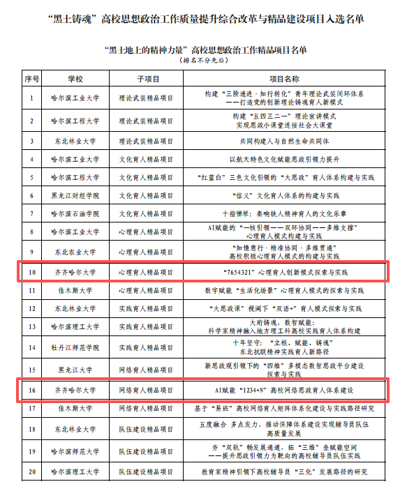 近日,黑龍江省教育廳正式公布“黑土鑄魂”高校思想政治工作質(zhì)量提升綜合改革與精品建設(shè)項(xiàng)目入選名單。我校學(xué)生工作部(學(xué)生處)主持申報(bào)的《“7654321”心理育人創(chuàng)新模式探索與實(shí)踐》和《AI賦能“1234+N”高校網(wǎng)絡(luò)思政育人體系建設(shè)》分別入選心理育人精品項(xiàng)目和網(wǎng)絡(luò)育人精品項(xiàng)目。
