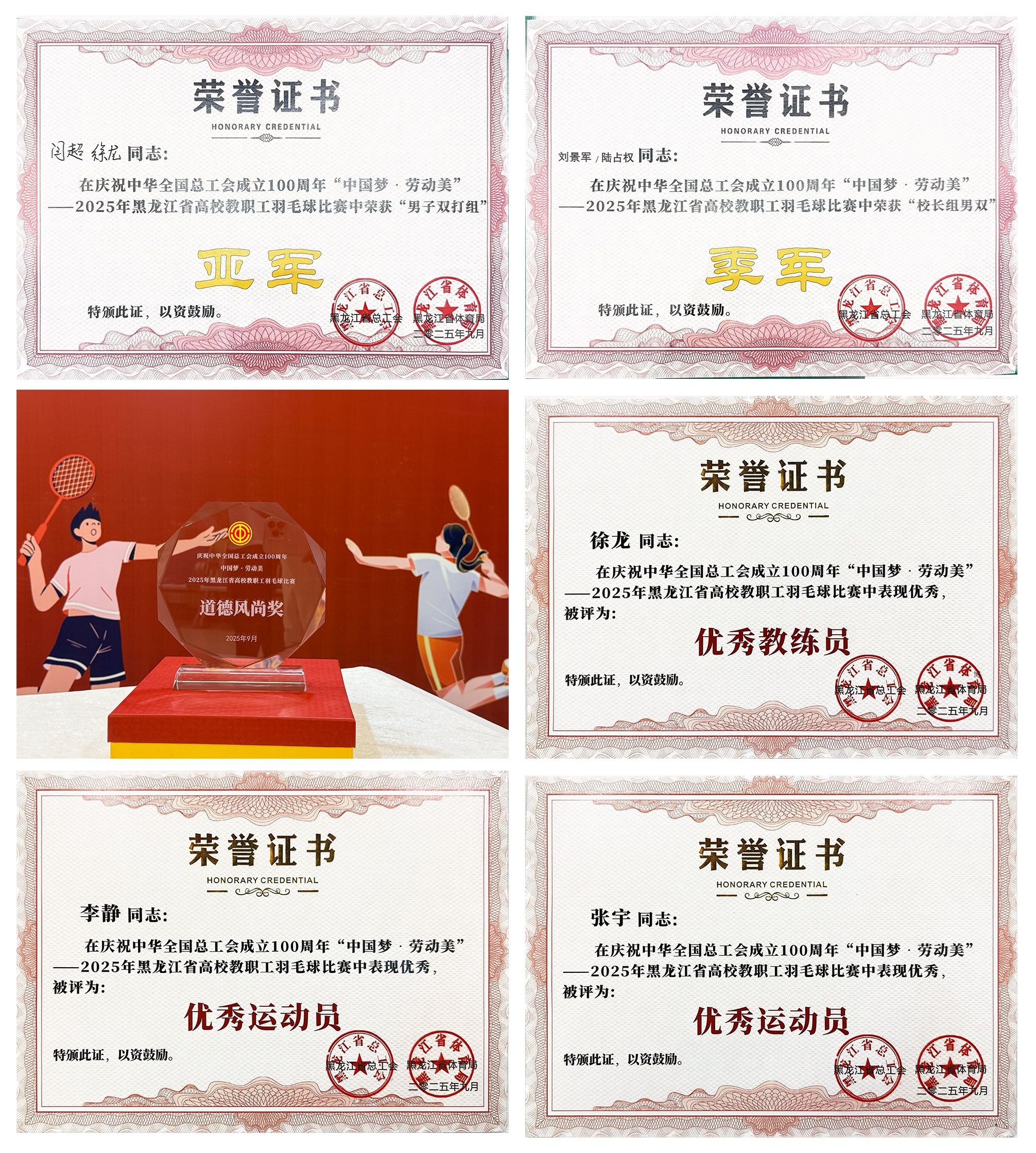 近日,由黑龍江省總工會、省教育廳、省體育局聯(lián)合主辦,省教科文衛(wèi)體工會承辦,黑龍江農(nóng)業(yè)工程職業(yè)學院協(xié)辦的“中國夢?勞動美——凝心鑄魂跟黨走,團結奮斗新征程”2025年黑龍江省高校教職工羽毛球比賽于9月17日至19日在哈爾濱成功舉辦。我校教職工羽毛球隊奮勇拼搏、表現(xiàn)優(yōu)異,在多個項目中取得突出成績,充分展現(xiàn)了我校教職工團結進取、昂揚向上的精神風貌。