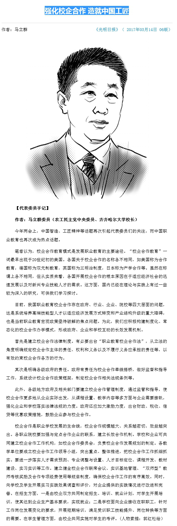 編者按:3月14日出版的《光明日報》在第6版“兩會特刊”專欄中刊發(fā)了我校校長馬立群的“代表委員手記”,隨后光明網(wǎng)、人民網(wǎng)、人民政協(xié)網(wǎng)、中國社會科學(xué)網(wǎng)、中國青年網(wǎng)、中青在線、東北新聞網(wǎng)、東方網(wǎng)、南海網(wǎng)、中國網(wǎng)東海資訊等網(wǎng)絡(luò)媒體進行了轉(zhuǎn)載。