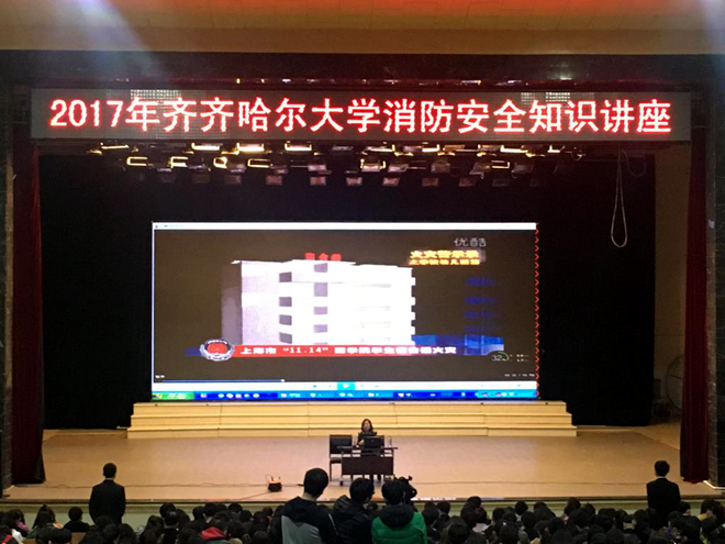 市消防支隊大校李清江、市消防支隊重點科科長劉環(huán)宇、保衛(wèi)處處長吳剛、副處長劉增發(fā)、學(xué)生處副處長張樹啟、舍務(wù)管理科同志、全體公寓管理員及公寓輔導(dǎo)員、舍管會學(xué)生干部以及學(xué)生寢室長代表1300多人聆聽了講座。講座聘請齊齊哈爾市消防支隊女子宣講團崔丹同志主講。