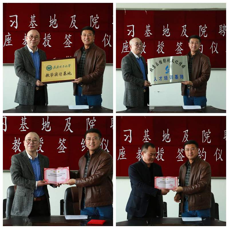 在儀式上,副院長肖國棟與北京樂桔影視文化傳媒公司總裁梁策共同簽署《齊齊哈爾大學(xué)北京樂桔影視文化傳媒公司共建實習(xí)基地協(xié)議書》;副院長肖國棟為北京樂桔影視文化傳媒公司授牌,樂桔影視總裁梁策接受牌匾;副院長肖國棟為院聘客座教授頒發(fā)聘任證書;樂桔影視總裁梁策為齊齊哈爾大學(xué)文學(xué)與歷史文化學(xué)院授牌,副院長肖國棟接受牌匾。